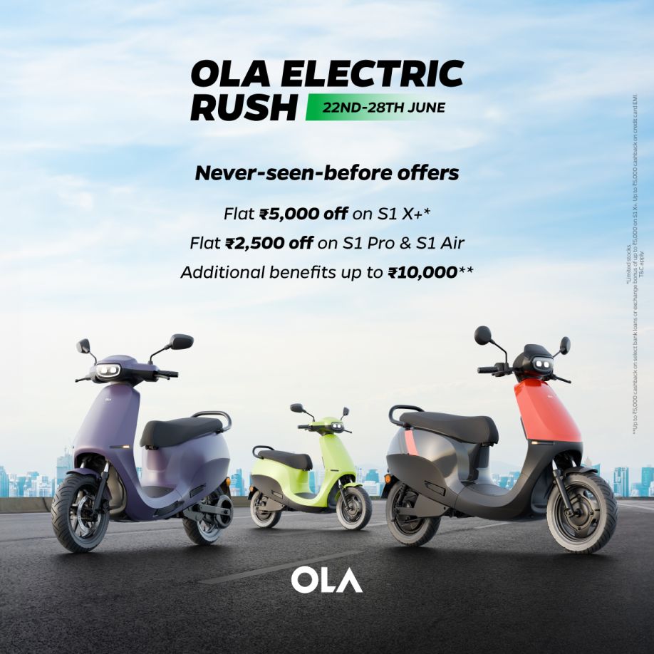 Ola Electric announced a range of exciting offers worth up to INR 15,000 on its S1 portfolio as part of its ‘Ola Electric Rush’ campaign. Effective till June 28, the offers include a flat discount of INR 5,000 on S1 X+ and INR 2,500 on S1 Pro and S1 Air. Customers can also avail additional benefits of up to INR 10,000, including exchange bonus of upto INR 5,000 on S1 X+ and a cashback of up to INR 5,000 on select credit card EMIs on the entire S1 portfolio.
