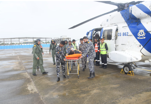 Indian Coast Guard (ICG) rescued a critically ill Indian national from Motor Tanker Zeal of Republic of Gabon about 20 km off Mangrol coast of Gujarat today, 21 July 2024. The patient had a very slow pulse rate and was experiencing numbness in the lower part of his body, which required him to be rushed for immediate medical attention.