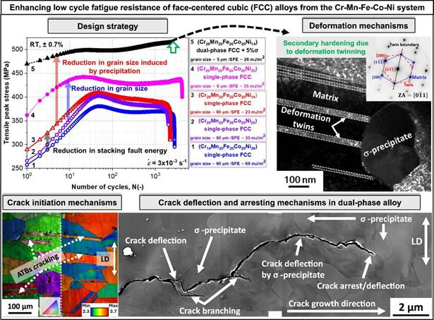 By adjusting the Cr/Ni ratio, they synthesized two single-phase face-centered cubic (FCC) MPEAs with distinct SFEs. The low-SFE alloy exhibited 10–20% higher cyclic strength than the high-SFE alloy while maintaining a comparable fatigue life. This improvement is attributed to the delayed evolution of dislocation substructures and a lower crack propagation rate in the low-SFE alloy compared to the high-SFE alloy.